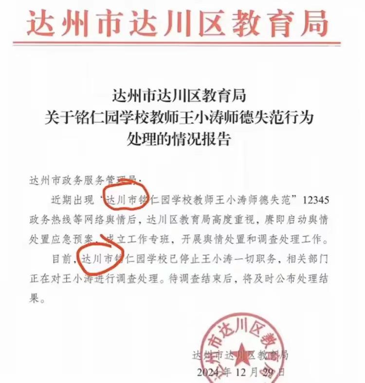 這件事在網上傳的沸沸揚揚,這位男老師的身份也被扒出來,在教育局發佈的通告中,我們可以看到這位男老師名叫王小濤,他已經被停職了一切職務,正在接受相關部門的調查。