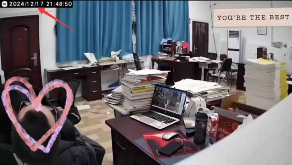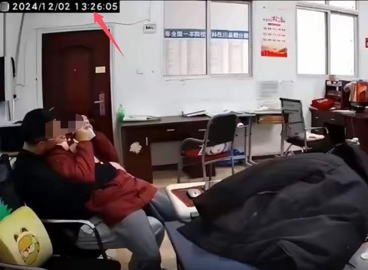 視頻監控拍下來的畫面不是很清晰,但可以看得出是女學生坐在男老師的腿長,兩個人抱着臉親吻,哎呦!這畫面好辣眼。