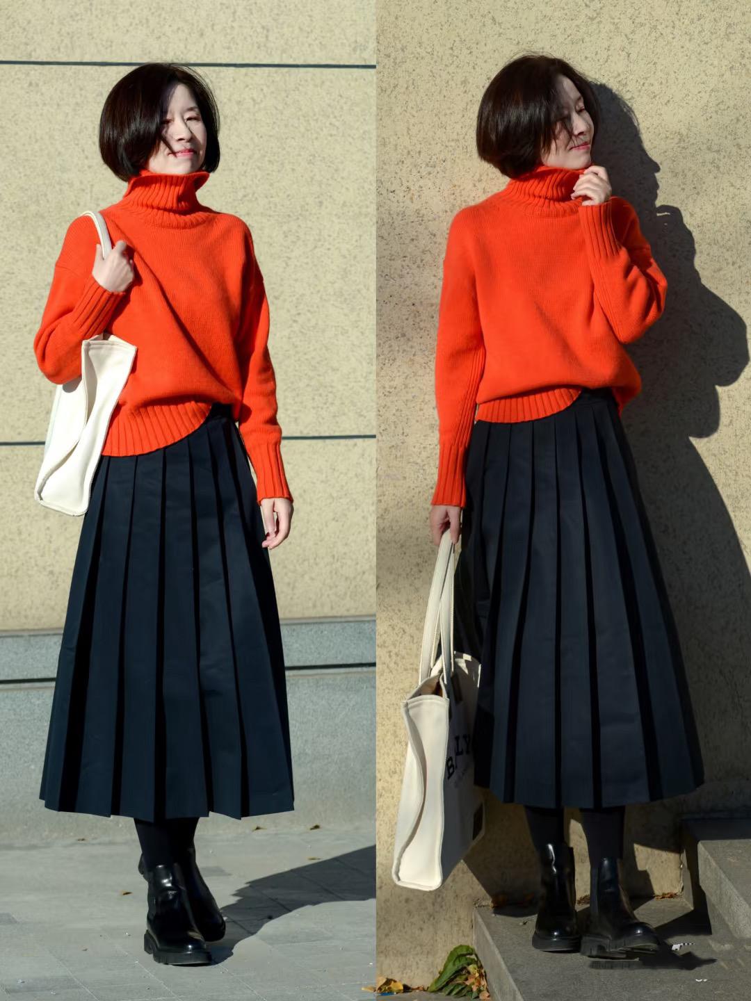 溫暖大方、又很遮肉的一組搭配。這種高領的紅色毛衣,配上高腰的百褶半身裙,屬於一種簡潔又很顯氣質的穿搭。
