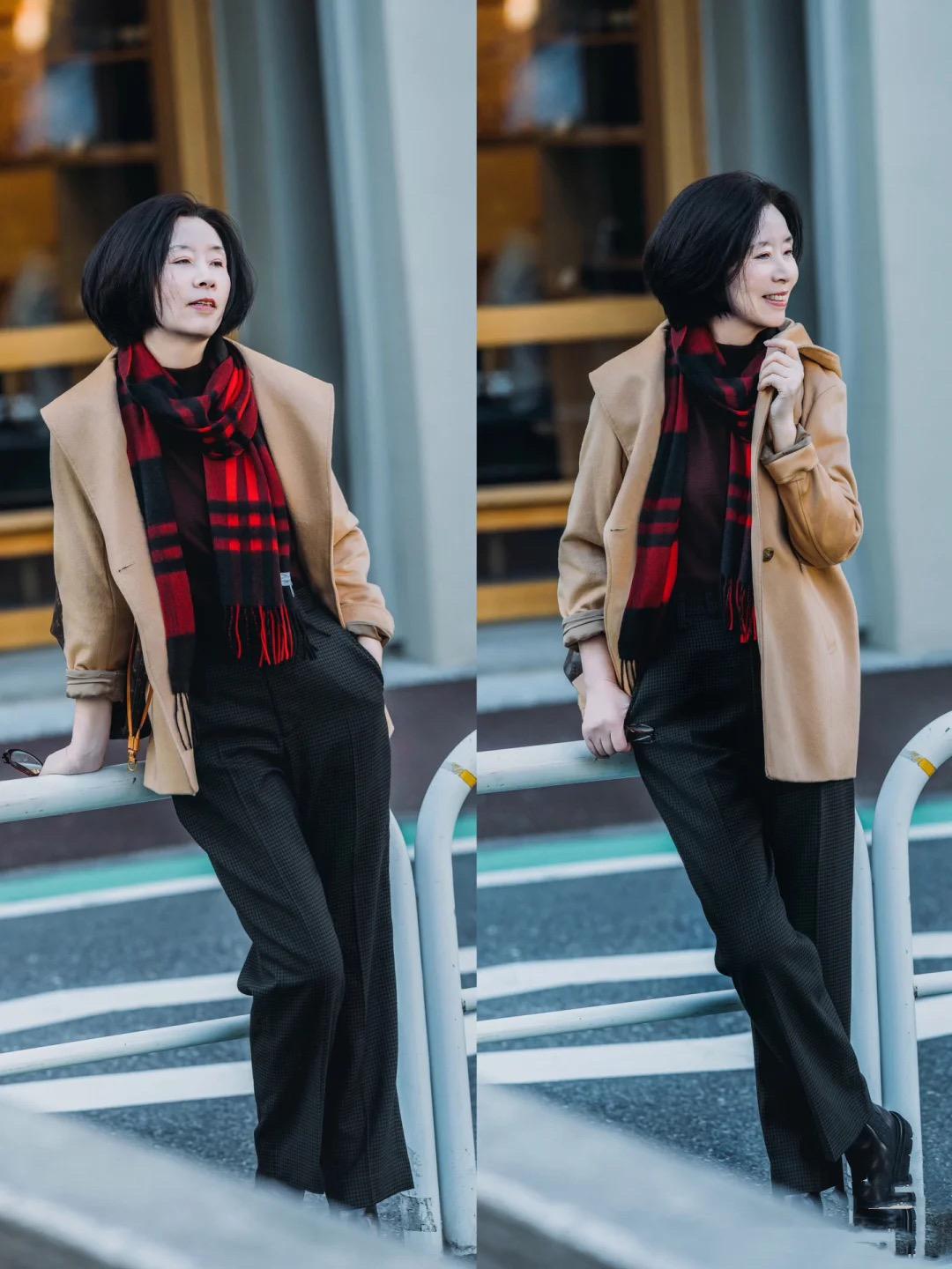 相對於毛衣、馬甲、針織開衫,紅色圍巾屬於一種更適合營造氛圍感、且更不挑人的單品。這種紅色格子圍巾,是高級優雅的美。