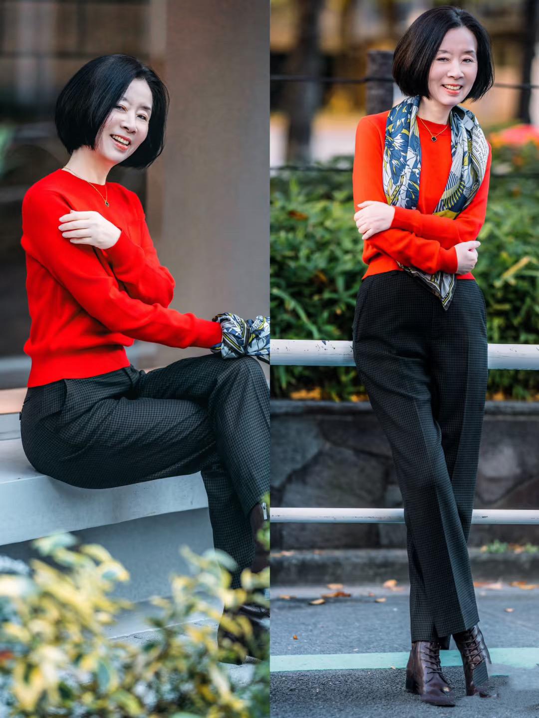 50+的年紀,依然喜歡精緻優雅的女神範穿搭。像這種相對修身的紅色針織衫,我們可以搭配更利落又修飾腿型的煙管褲來穿。