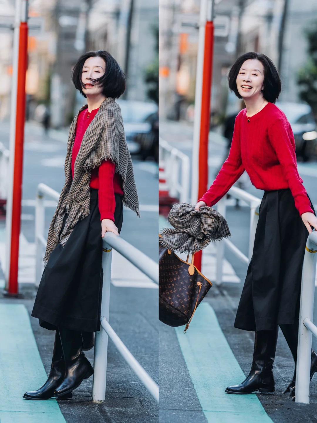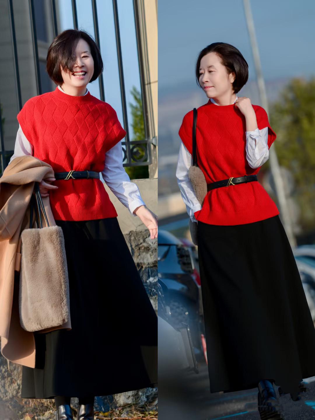 這種圓領的紅色針織衫,可以配高腰的A字形半身裙,溫柔舒適。大披肩直接點綴,有一種更大氣的美。紅色針織衫配披肩、適合大齡女性,可以凹造型又很顯氣質。