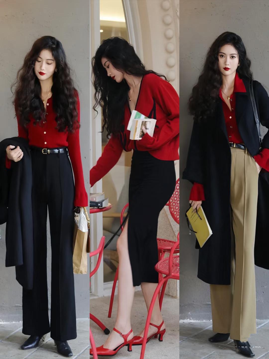 紅色系的毛衣,我們可以嘗試比較輕薄的款式。輕薄的紅色毛衣作爲內搭、更洋氣也更修身。紅色毛衣配上黑色大衣、又美又高級。