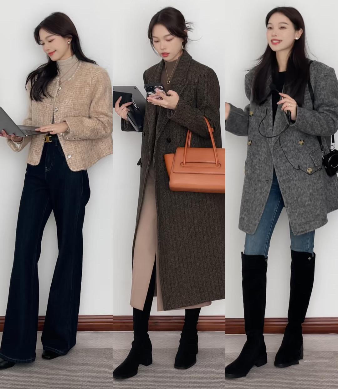 寬鬆的毛呢西服外套,配上修身的牛仔褲、可以顯得雙腿纖細修長。修身的牛仔褲配上長筒靴,時髦又顯氣質。