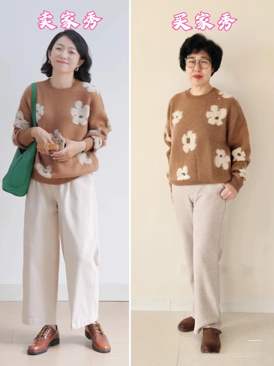 像這種棕色的印花毛衣,白色花朵修飾好是惹眼。這種棕色毛衣,我們可以配燕麥的的闊腿褲,屬於一種很溫柔、也很低調的打扮。