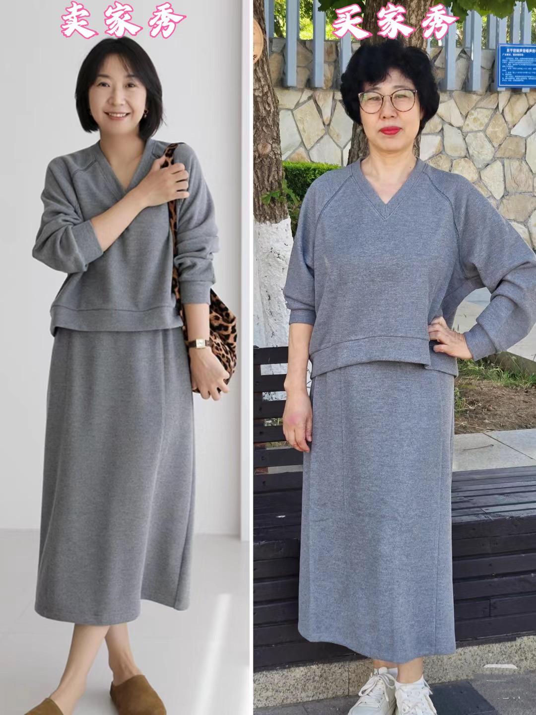 灰色系的套裙,我們可以配白色板鞋來穿。如果大齡女性身材豐滿,可以選擇稍微寬鬆的灰色套裙。白色的板鞋,很乾淨也很減齡。
