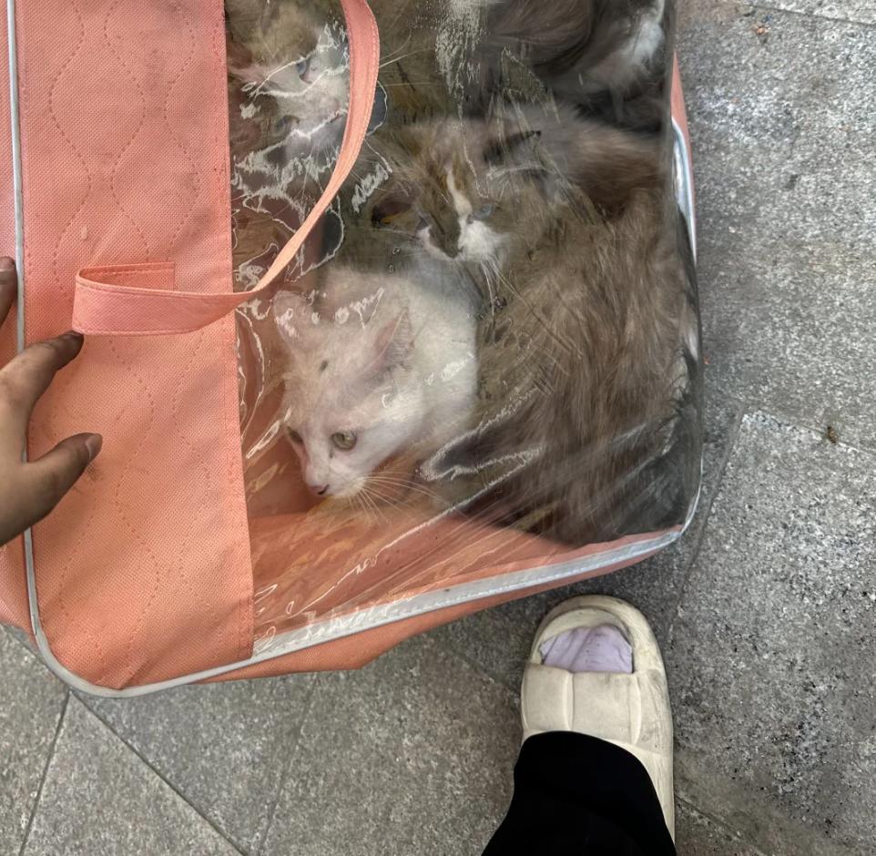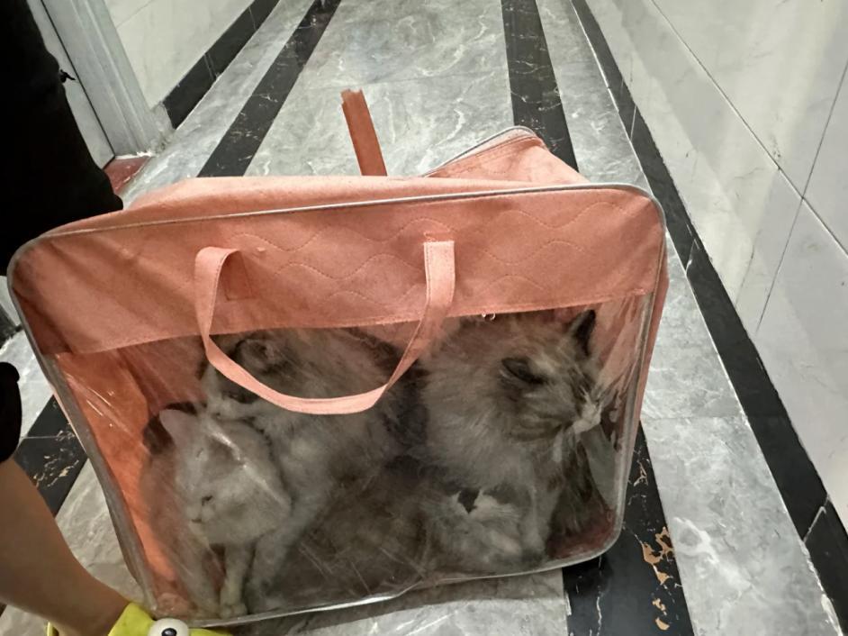 突發火災,妹子來不及思考,而是本能地找出一個棉被袋,一口氣將7只壯碩的貓咪給裝進去,整個時間沒有超過一分鐘。