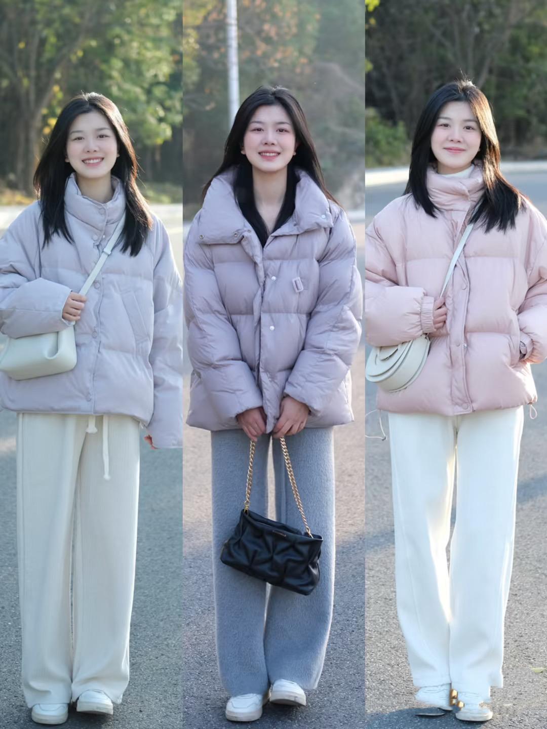 這種淺肉色系的羽絨服,與毛呢褲的搭配也很舒適。白色的毛呢闊腿褲,配上厚底的鞋子,大方又顯高。白色毛呢褲,也更顯氣質。