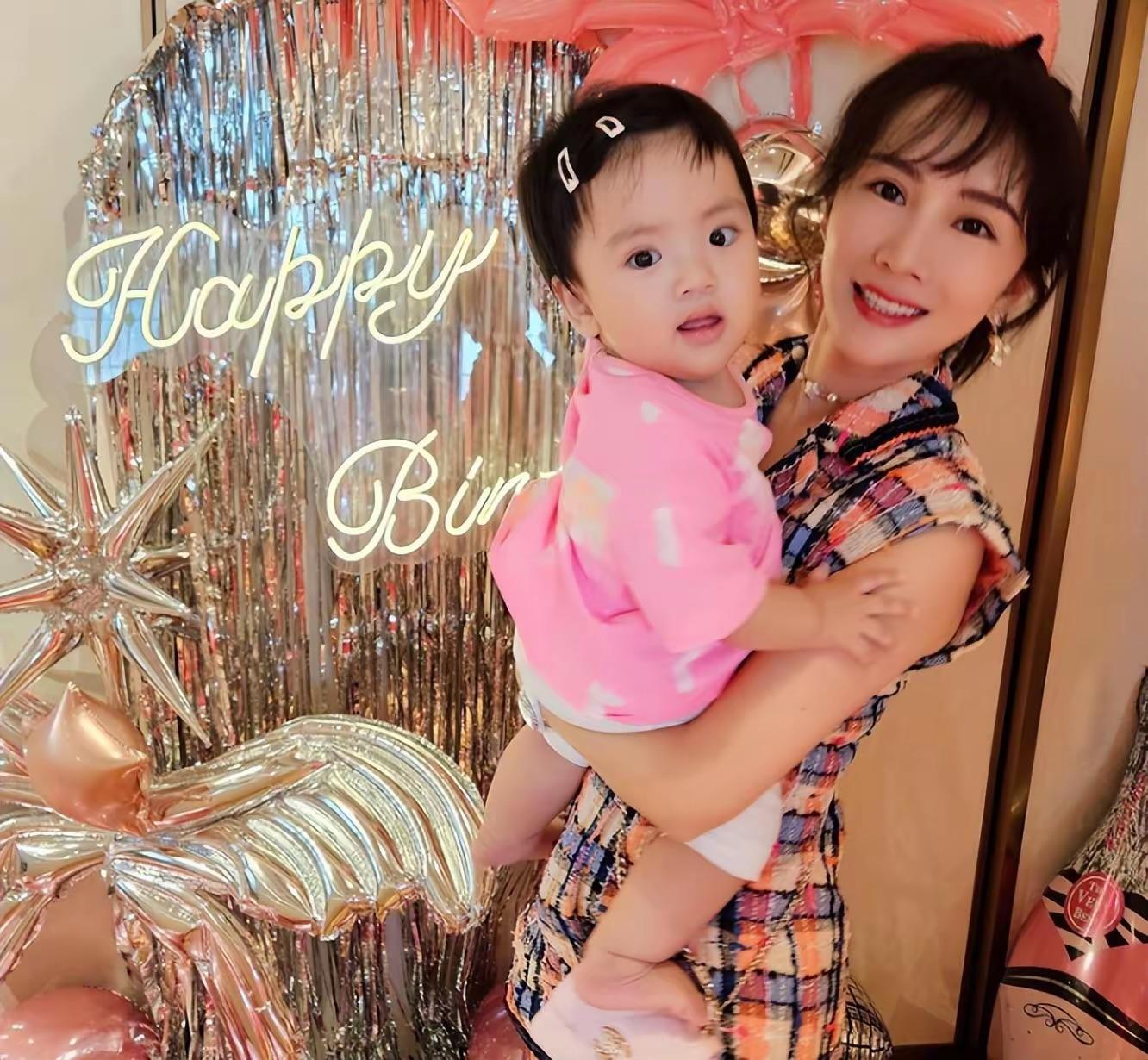 這應該是李念的女兒吧,穿着粉色T恤、頭上還帶着夾子,可可愛愛的,完美繼承了李念的美貌。