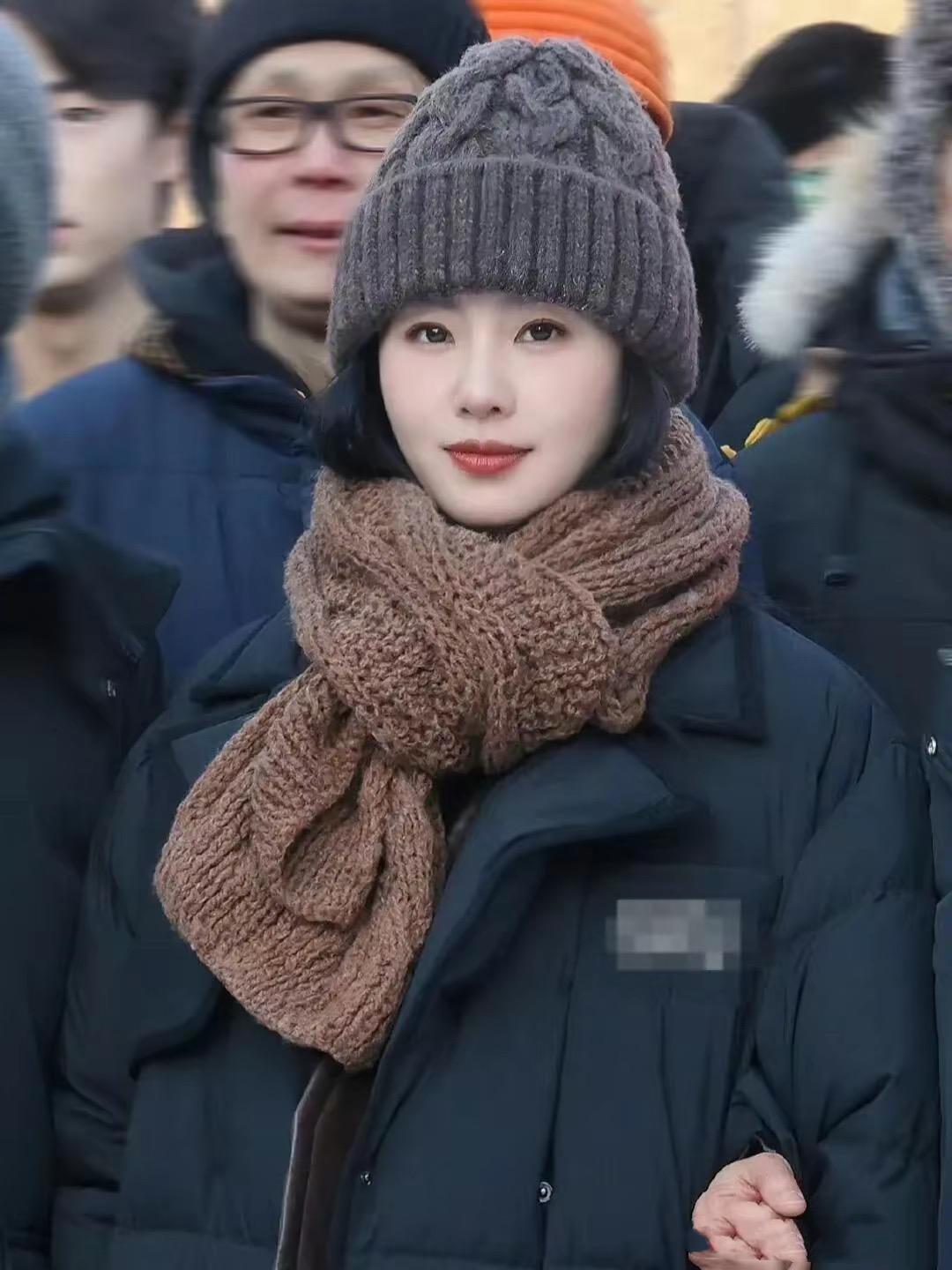 黑色的長款羽絨服、棕色的毛線圍巾,帶一點復古情懷、也更有腔調。不過劉詩詩的臉是真的垮了,戴圍巾、帽子都救不了。