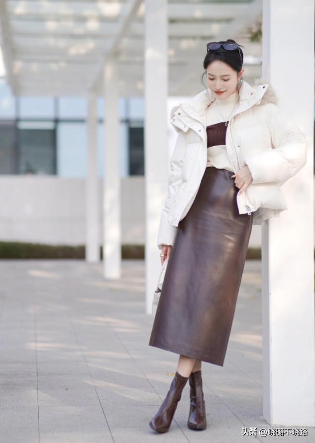 羽絨服配半身裙能夠呈現出更多的優雅與洋氣,但是大家一定要關注羽絨服的衣襬和半身裙裙襬之間的高度差,兩者齊平的話容易給人臃腫厚重的感覺,但如果半身裙的裙襬完全隱藏在羽絨服裏,將羽絨服敞開穿之後能夠更好的拉伸比例,顯得人格外的高挑纖細。想要更加端莊大氣,可以選擇過膝羽絨服+及踝半身裙的組合,豐富層次的同時突出優雅感。