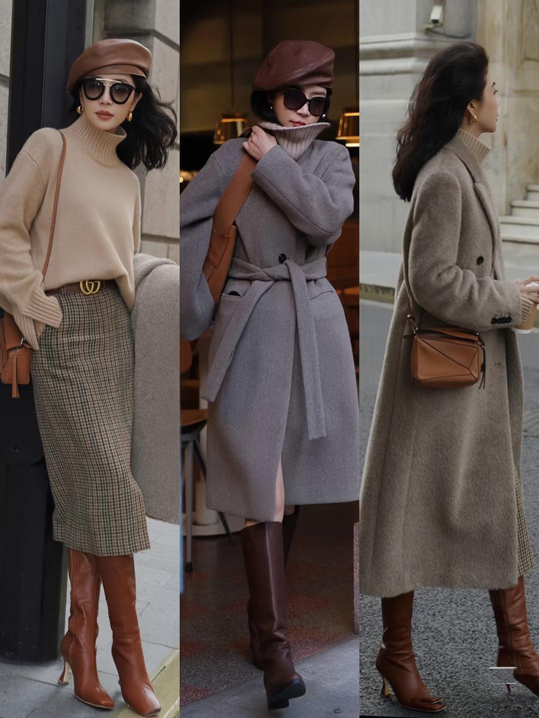 毛呢外套不必搭配太冗長的款式,一般過腰遮胯、或者剛剛到大腿的長度就足夠了。毛呢面料厚實防風、既保暖又不會顯得臃腫、壓個子。