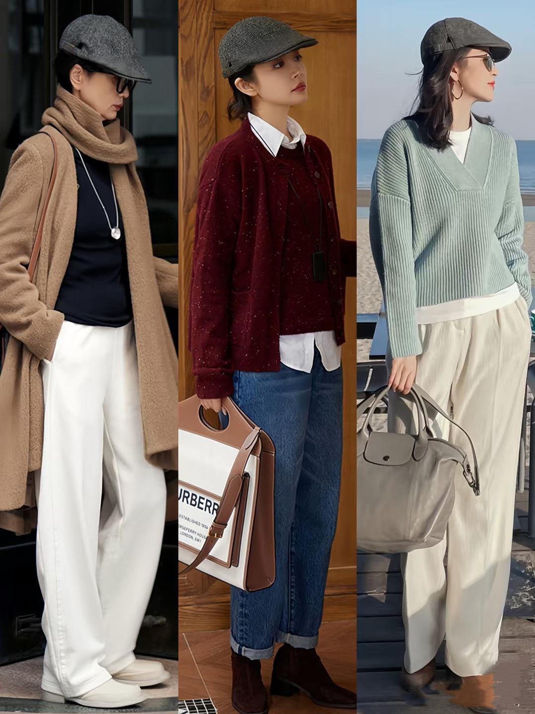白色T恤/襯衫作爲內搭,配V領的針織衫頸部線條更優越。一條白色直筒褲,打造出慵懶隨性之美,冬天裏的白色直筒褲也是白搭顯氣質。
