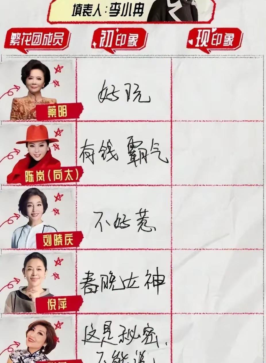 看李小冉填的表格,她對這幾位奶奶的印象,簡單粗暴、簡直直擊要害。比如他說蔡明好玩,陳嵐有錢霸氣,劉曉慶不好惹,倪萍春晚女神,張薔直接是這是祕密不能說!