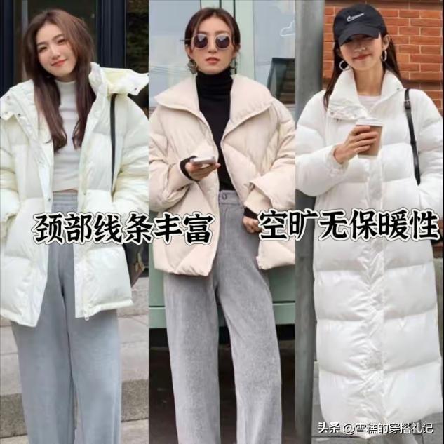 大家不要選擇圓領的打底衫,和羽絨服的領口完全堆疊在一起,看着有些厚重臃腫。換成這種半高領的修身打底,可以更好地勾勒出頸部和肩膀的線條,看着更加纖細。