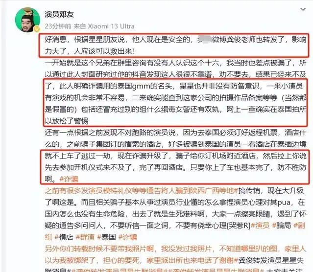 也有不少演員朋友發文,表示星星目前是安全的,人還活着。很多大V、知名的演員都轉發了,人多力量大、希望可以救出來。