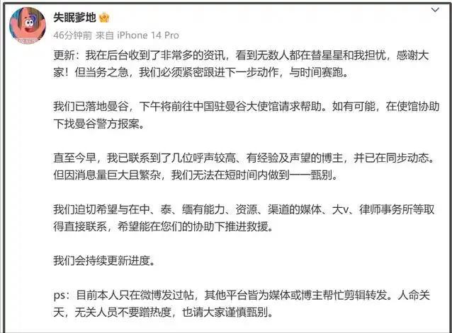 目前星星的女朋友和他的弟弟已經落地曼谷,將前往中國駐曼谷大使館尋求幫助。迫切希望在中、泰、緬有能力、資源、渠道的媒體、大V、律師事務所取得直接聯繫。