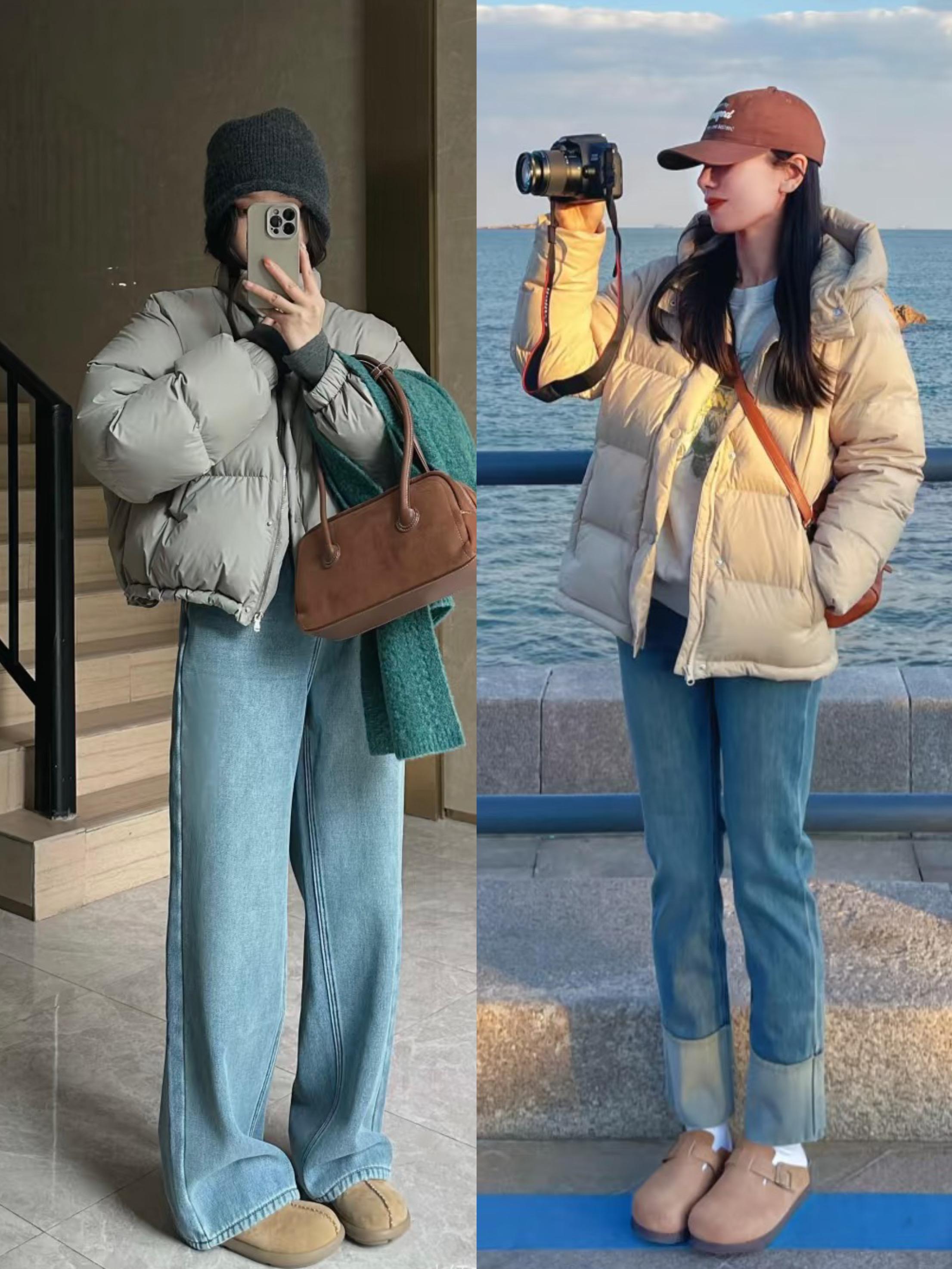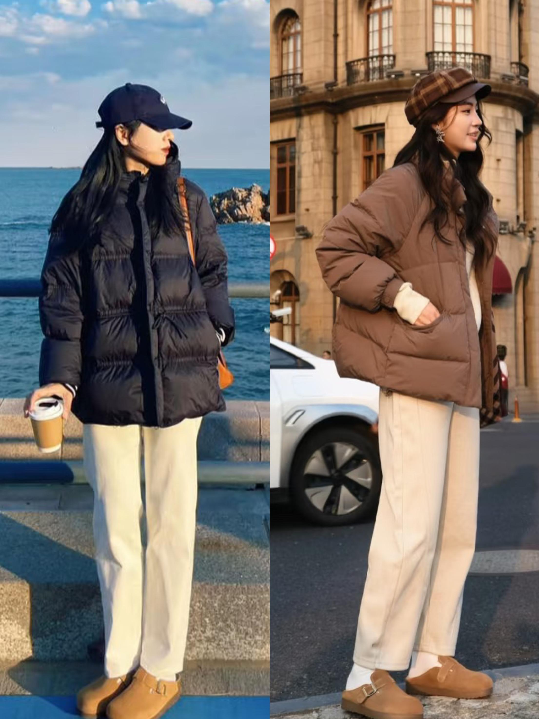 用保暖係數高的羽絨服,搭配毛呢的直筒褲、不包後跟的勃肯鞋,簡單又提氣質。像這種勃肯鞋、圓潤的鞋頭舒適又大方。