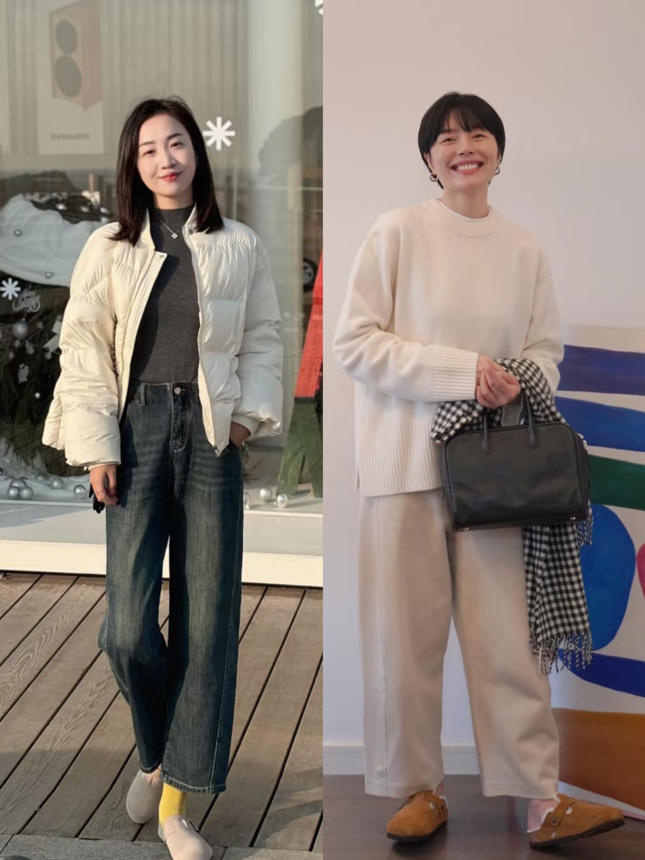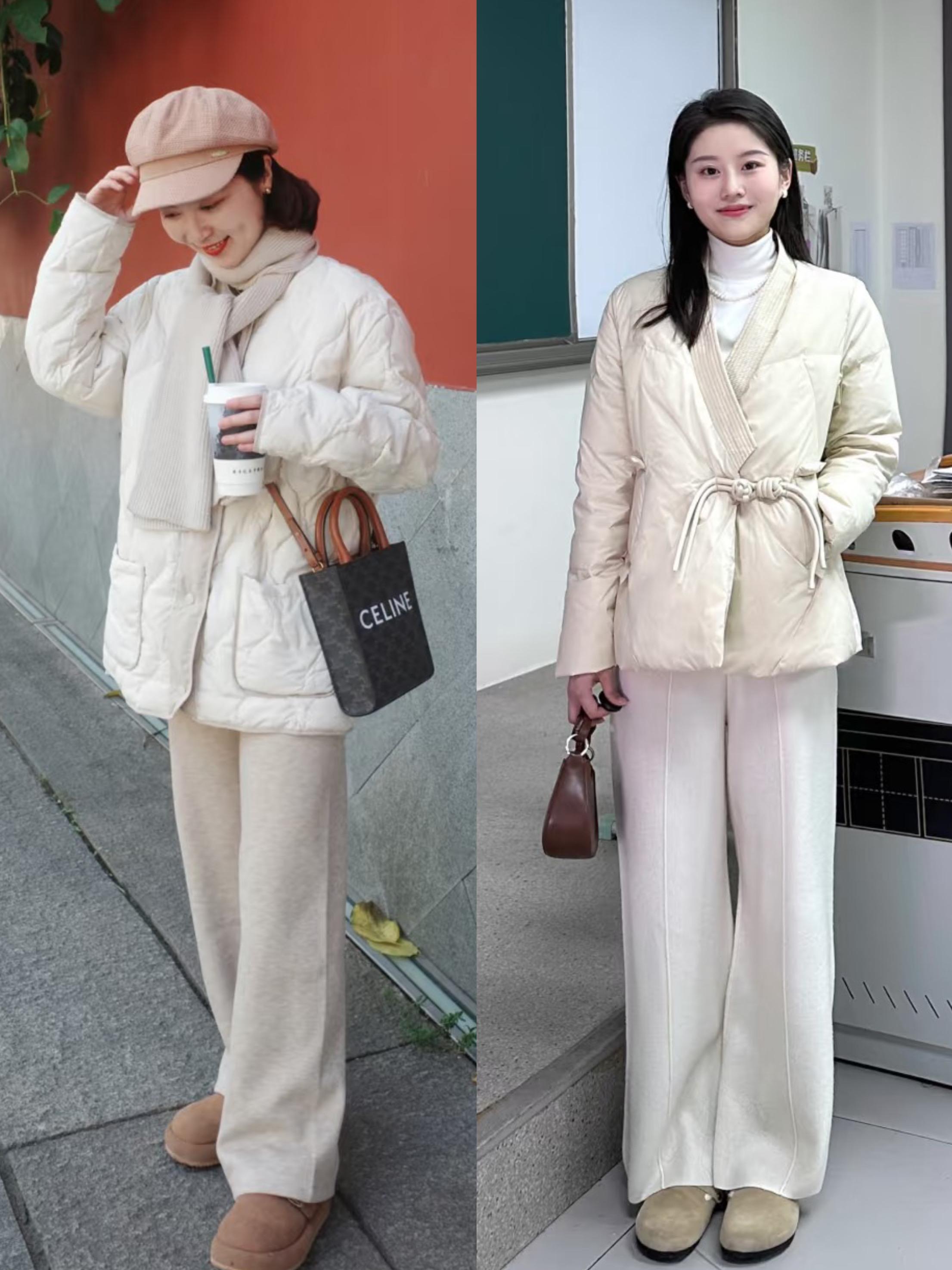 在這個冬天,既舒適又慵懶的穿搭,誰能不喜歡呢?一件米白色的外套、羽絨服,可以配同色系的直筒褲,舒適大方、好有氣質。