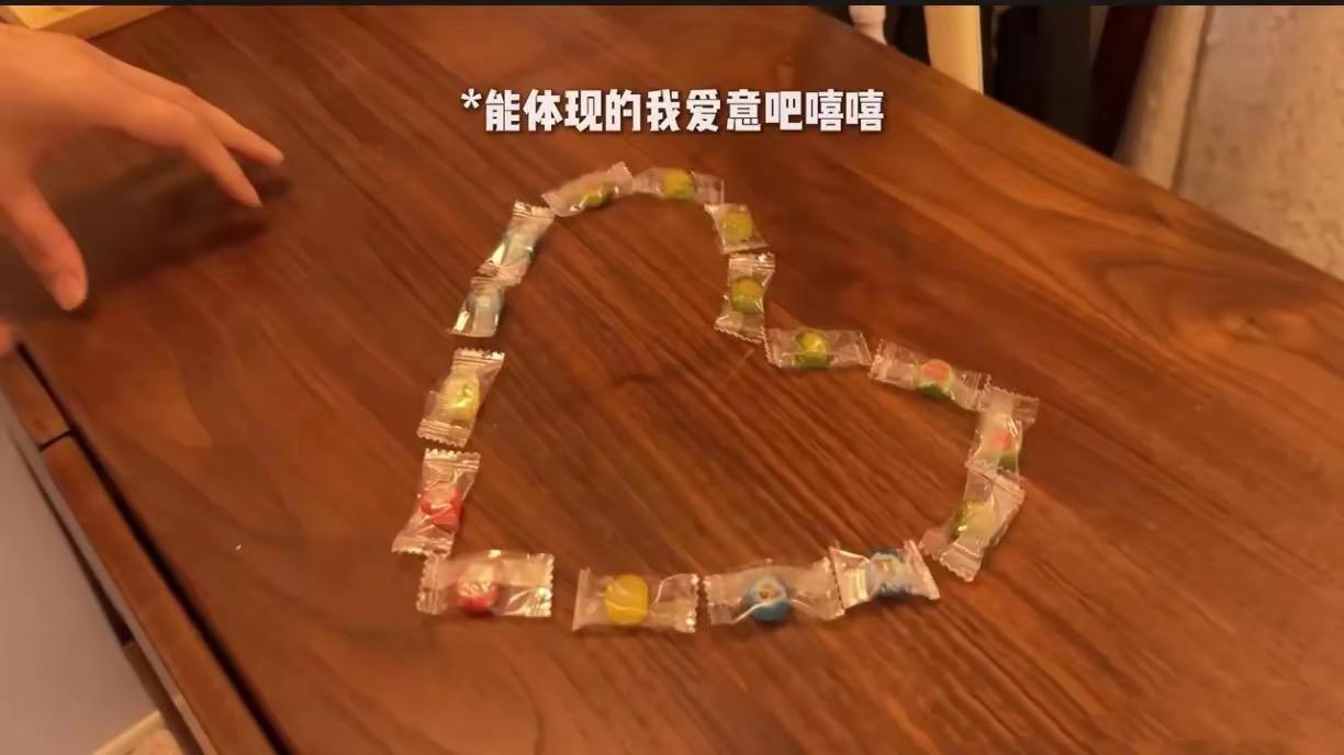 就連桌子上的糖果,都擺成了愛心的形狀。這簡單直白的愛意,赤裸裸又甜蜜蜜的表達,太會了吧!