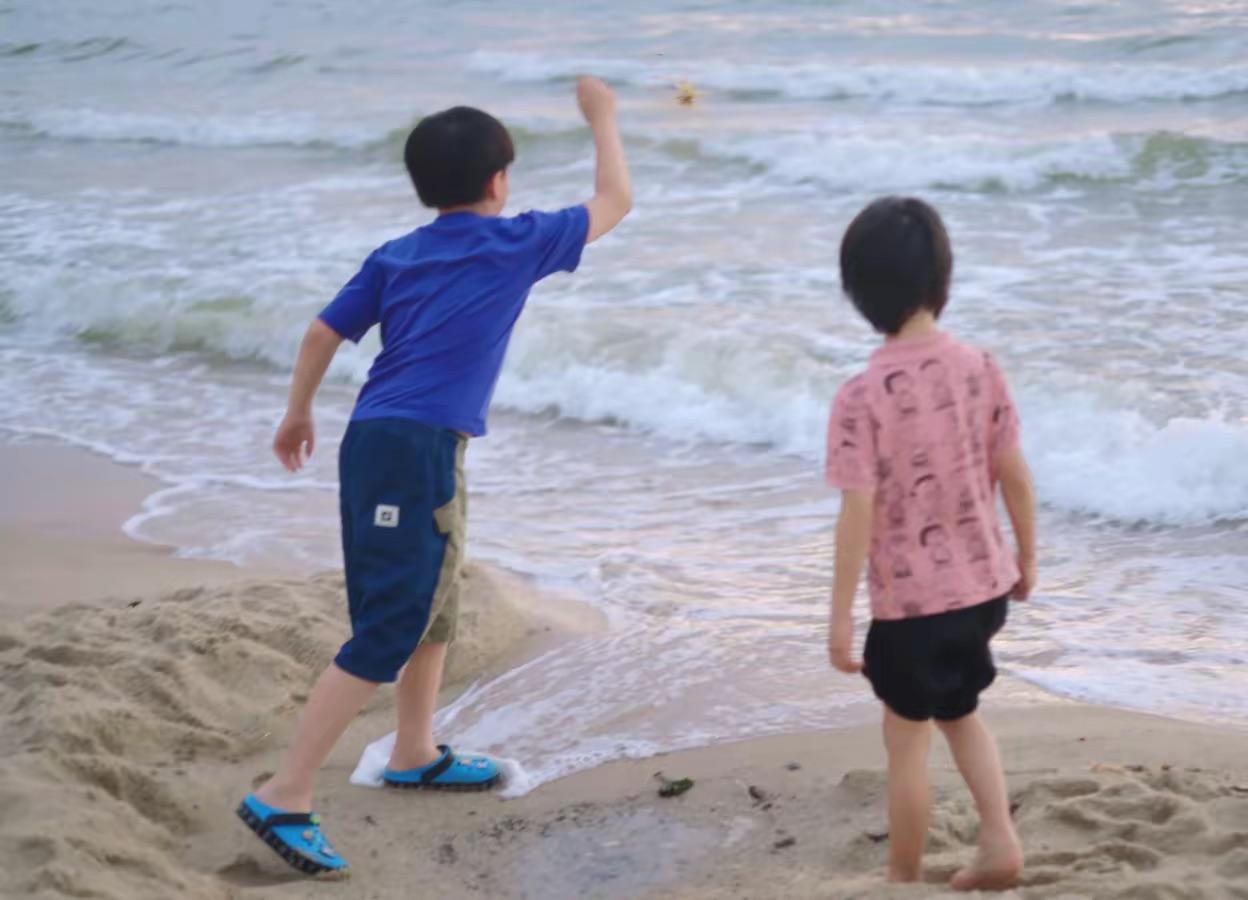 因爲這一場相遇,四坨也有了自己的晚班。他和張梓墨一起在海邊玩耍,跟着小哥哥特別開心。張歆藝和袁弘沒有讓兒子出鏡,從他的背影可以看出來,四坨個子超高、皮膚也很白。