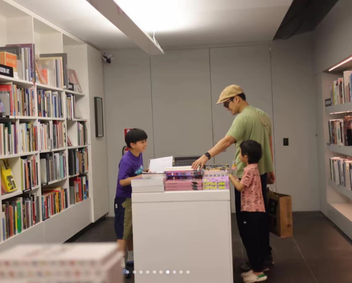 他們還一起逛了圖書館,張梓墨開心的翻着有趣的圖書,四坨緊緊地跟在爸爸身邊、還拽着爸爸的衣角。