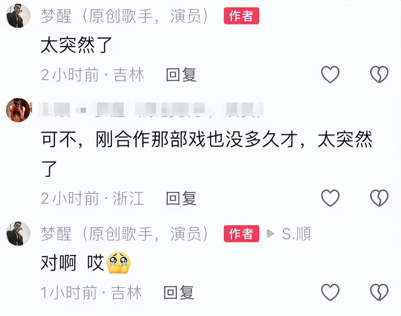 現在覺得太突然了,也有好友表示,剛一起合作過,真的是一時間無法接受。剛合作那部戲也沒多久才,太突然了,一句話就讓人破防了。