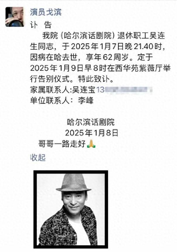 1月8題,哈爾濱話劇院發了訃告,退休職工吳連生同志,於2025年1月7日晚21.40時,因病在哈去世,享年62歲。