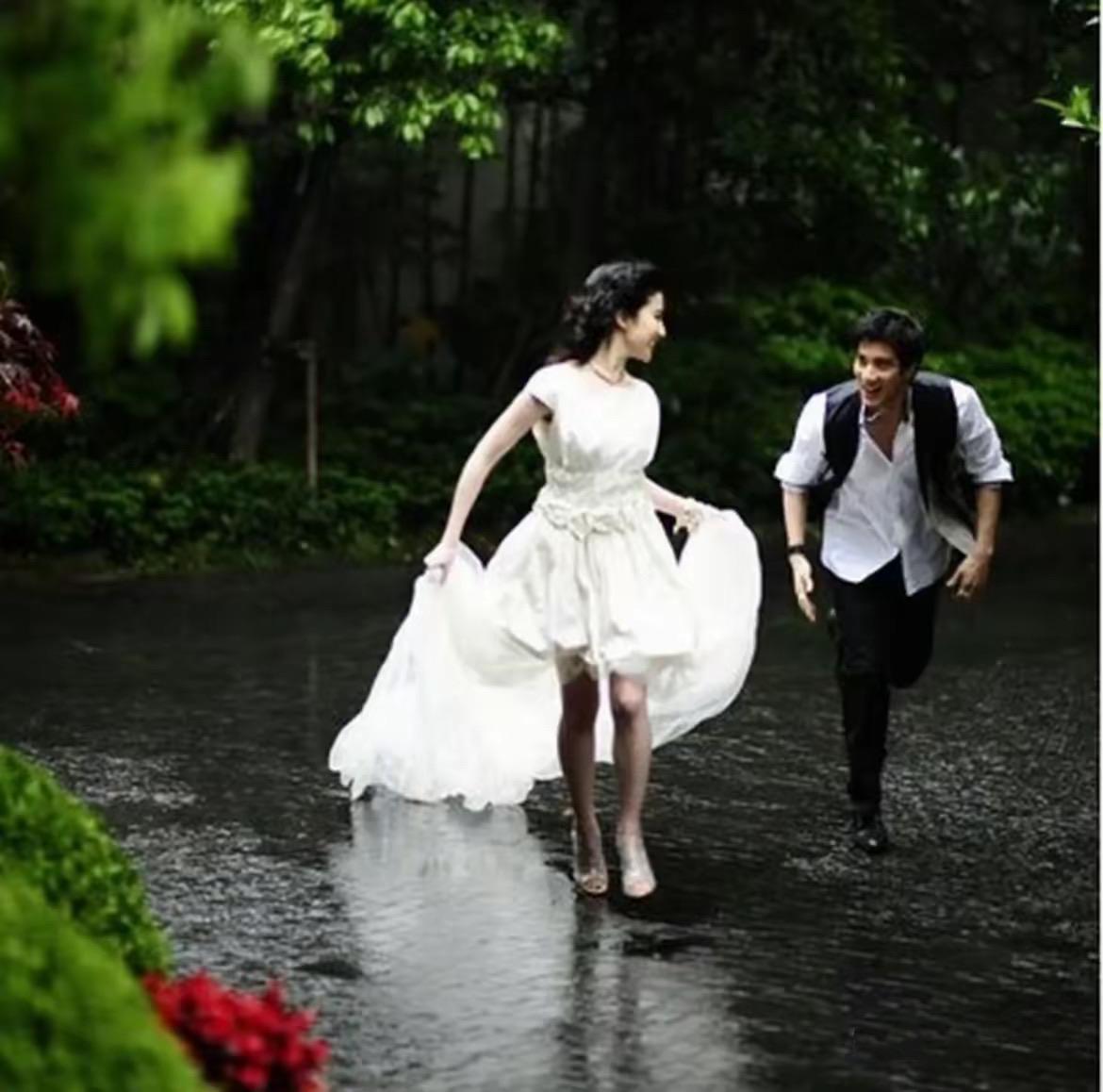 還有的就是男生幫忙提着裙子,或者撐着雨傘,兩個人一起奔跑,滿臉都是燦爛的笑意。