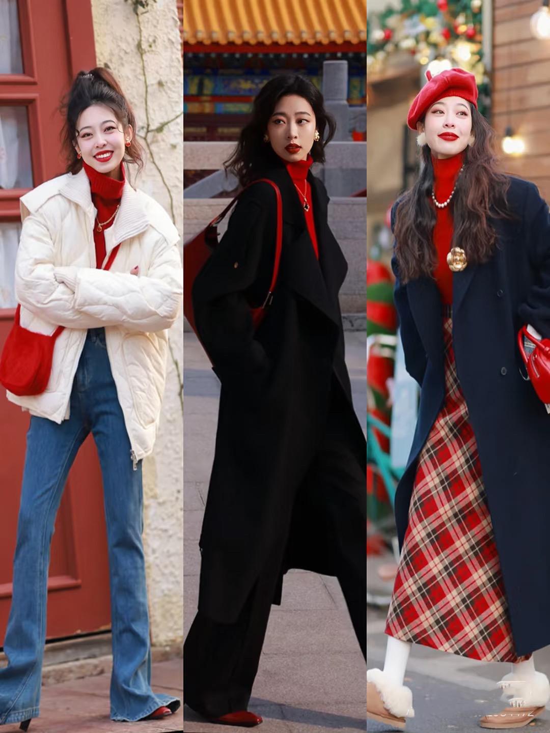 半高領或者高領的紅色毛衣,直接配寬鬆的大衣、或者羽絨服來穿,保暖又洋氣、氣質上也更高級。這種高領毛衣配珍珠項鍊也顯貴。