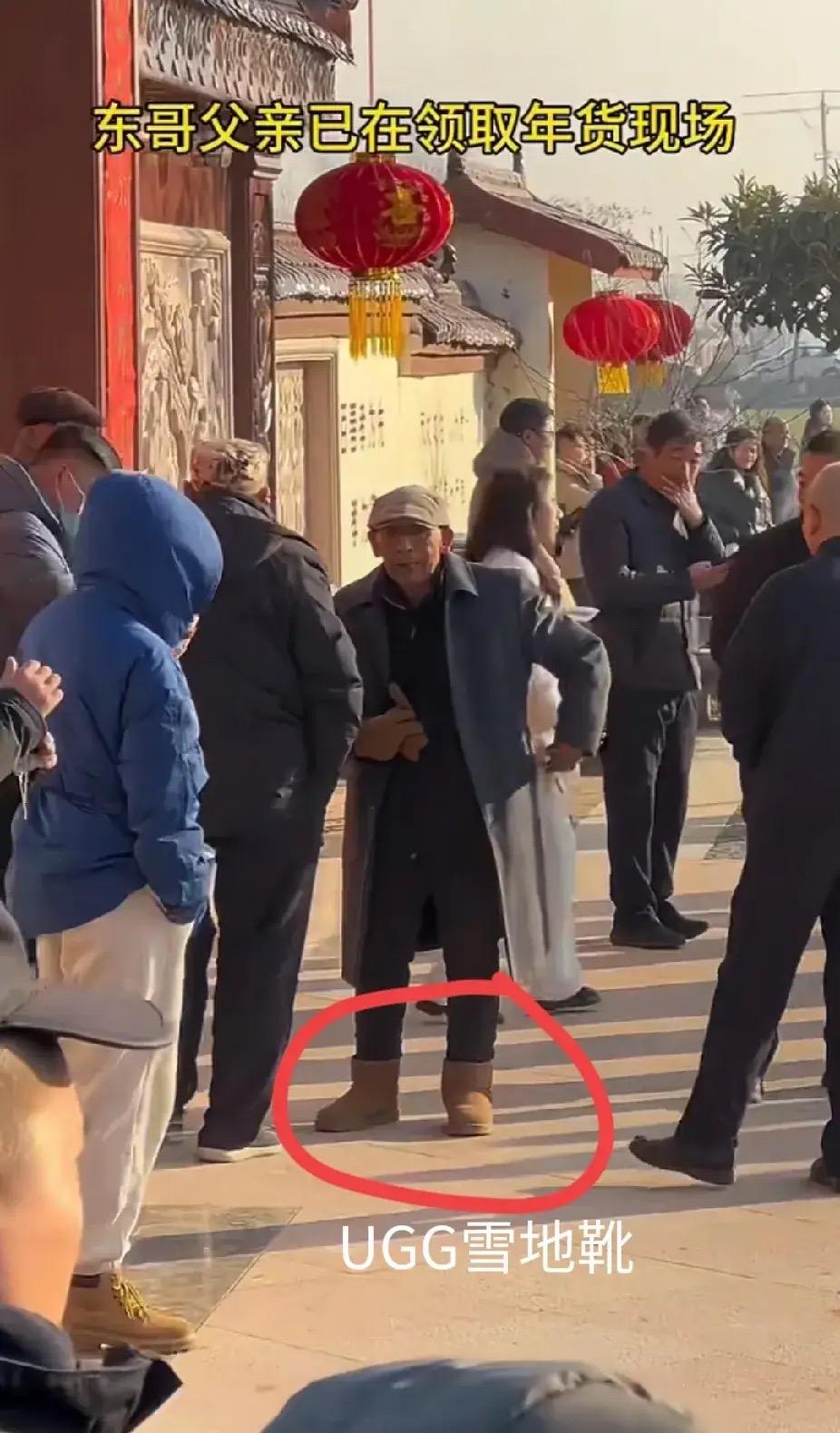 劉強東的父親也沒閒着,他走在鄉親們中間,穿着一件利落的灰色大衣、戴着報童帽,還穿着一雙UGG的雪地靴,這樣的老人家,穿上雪地靴真是有點挺突兀的。