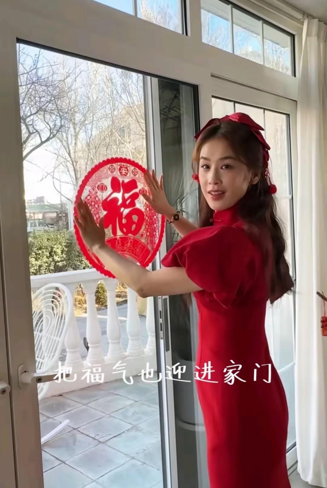 看黃聖依貼窗花時候的模樣,修身的旗袍勾勒出曼妙的體型,這前凸後翹的姿態簡直就像少女一般。
