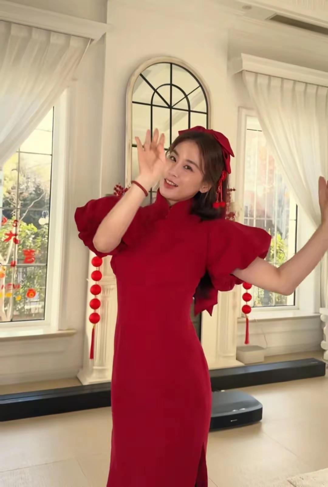 穿着紅色改良版旗袍,頭上戴着紅色的髮飾,黃聖依的這一組打扮真的是足夠喜慶。可以看出她家裏非常暖和,到了門外還只穿一件短袖的旗袍。