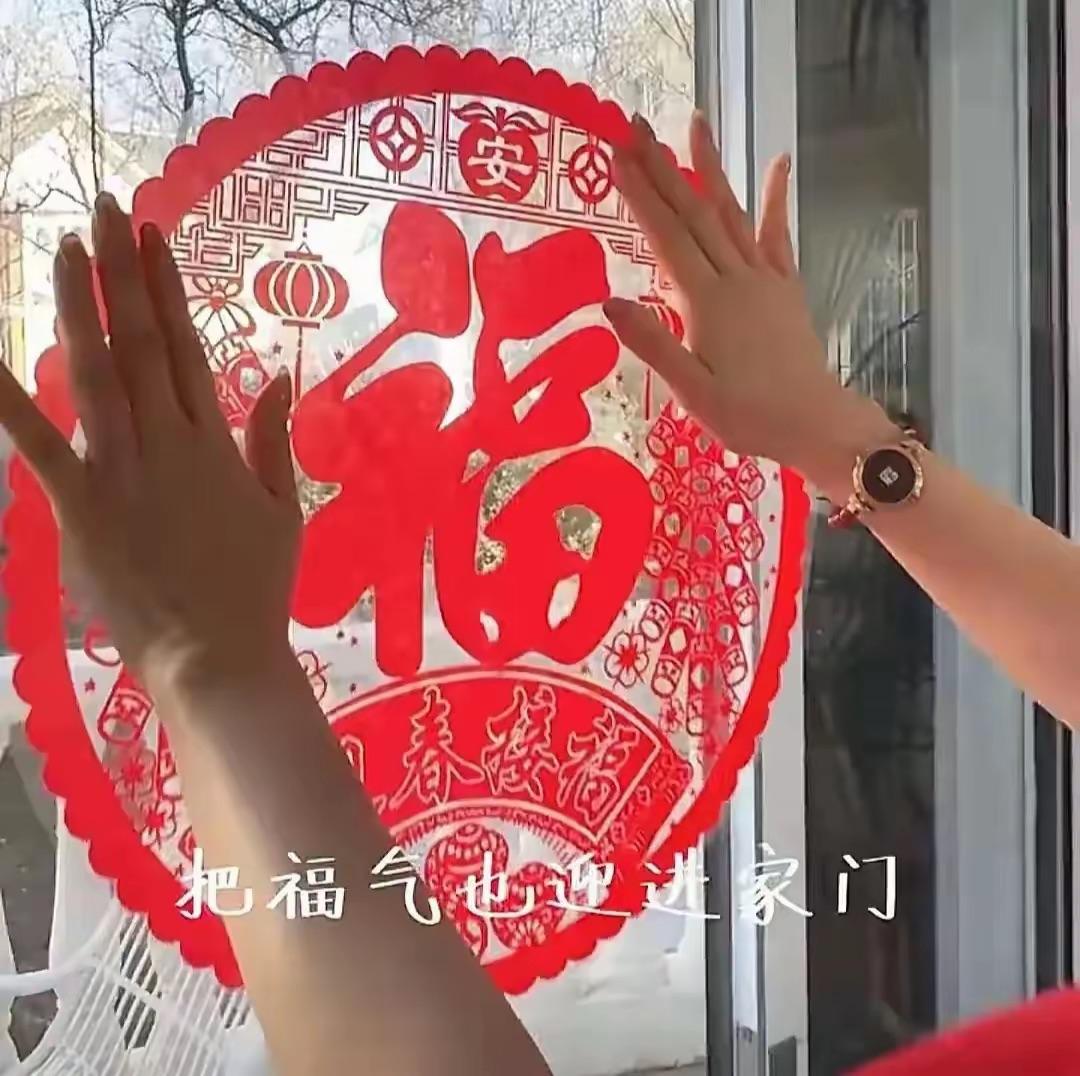 黃聖依不僅寫了對聯、還剪了窗花。看她細心的把紅色的福字貼在窗上,每一個動作都小心翼翼。