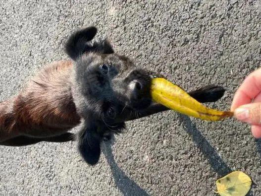 等到小狗走近了,她才發現小狗嘴裏叼了一片樹葉。雖然樹葉在路邊很常見,可小狗嘴裏的樹葉倒是完整且精緻,看樣子是經過精挑細選的。