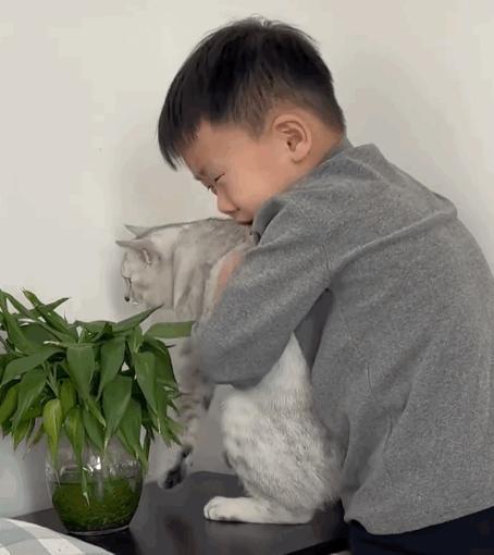 小男孩哭得傷心,抱着貓咪生怕它離去。