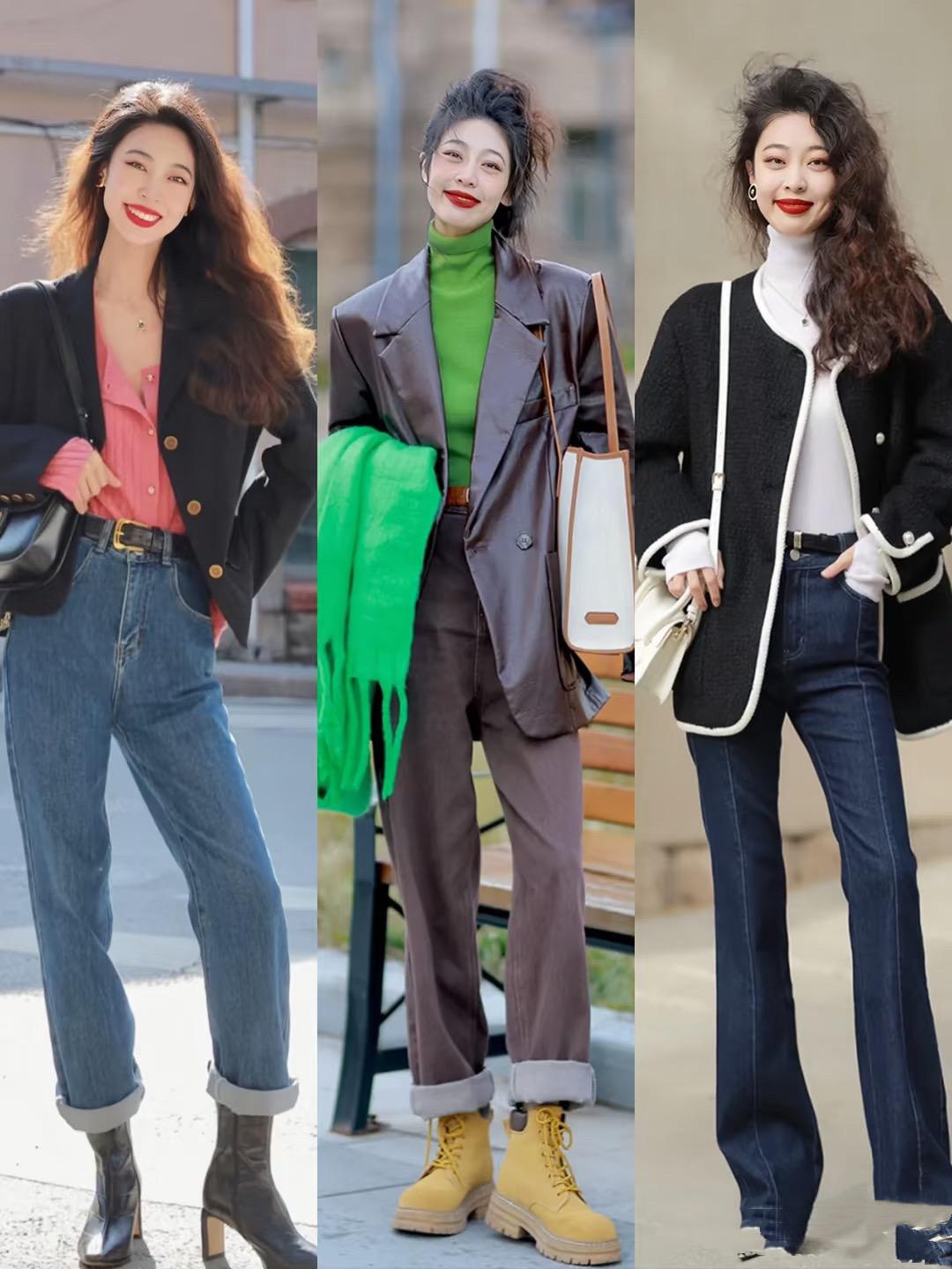 寬鬆西服外套+牛仔闊腿褲+厚底鞋
