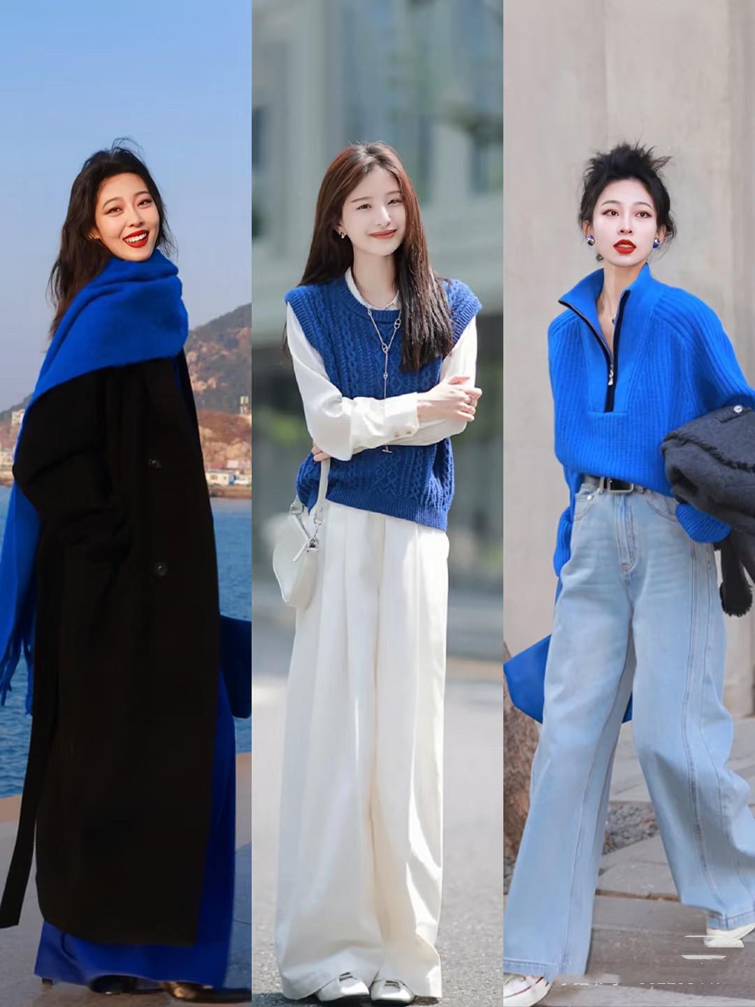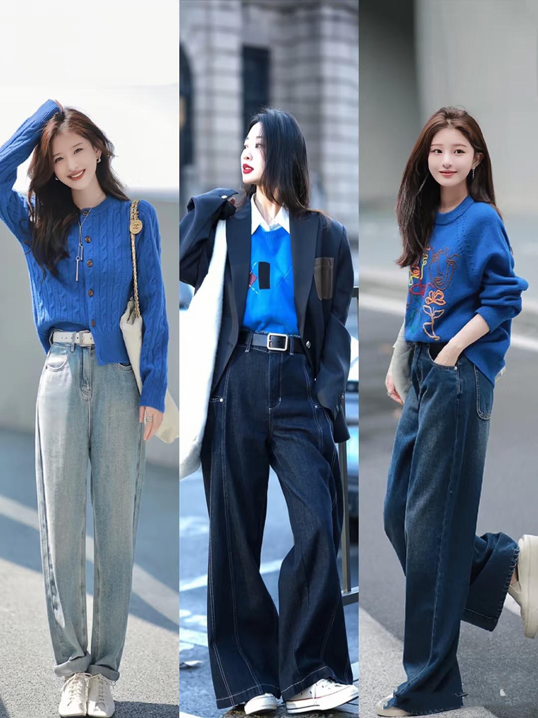 半拉鍊的毛衣、克萊因藍的顏色,非常醒目又顯白。對於小個子來講,這種毛衣塞褲腰的方式,就會很拉風。