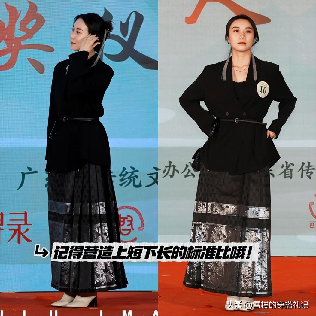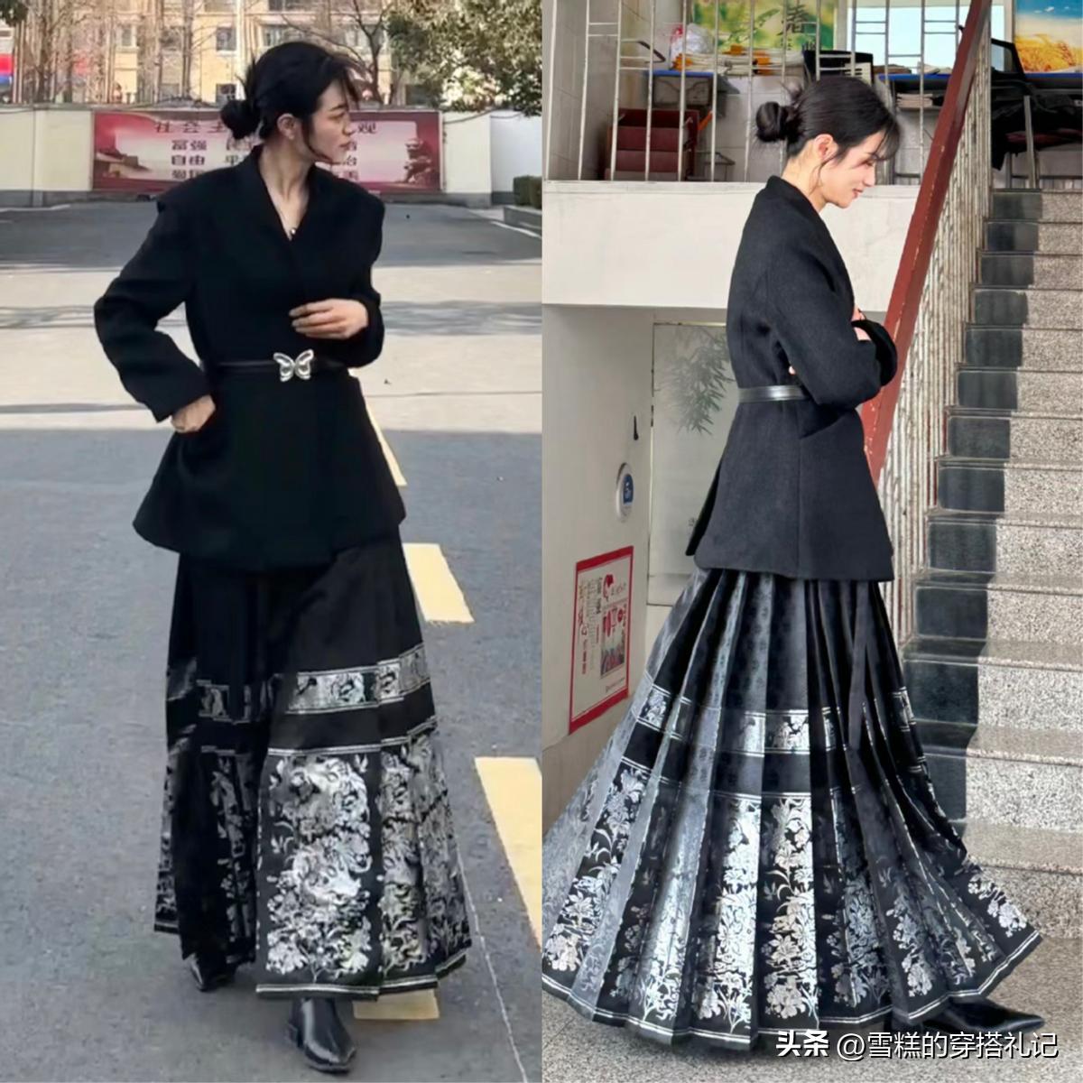 馬面裙長度的選擇在這其中還是比較關鍵的點,建議各位女性可以根據自己本身的身材比例狀態以及腿長去進行衡量。如果想要更凸顯利落感的話,那麼可以搭配剛剛好的長度又或者是九分長的設計,如果想要出片又或者是彰顯腿型的視覺長度,那麼偏長款的版型更適合你。