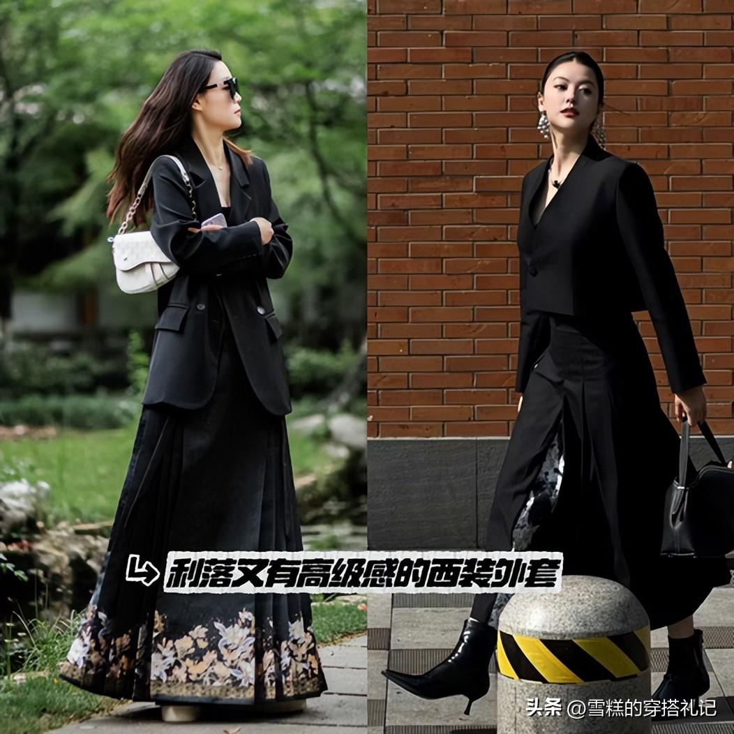 最後一個經典的穿搭單品就推薦利落又高級且能夠襯托出來好看冷酷的西裝外套了。與本身就利落明朗輪廓的馬面裙進行結合,兩者皆可以選擇同爲暗色調爲主,穿出來的感覺顯瘦又利落。