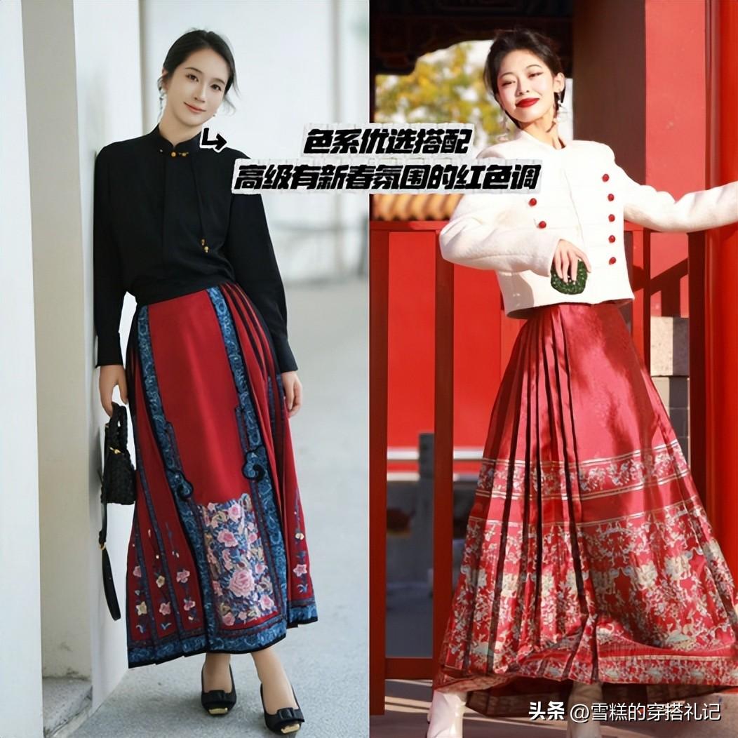馬面裙這一款裙裝單品作爲今年新春戰袍的存在。那麼在最初入選的時候,當然是要強烈的推薦各位女性可以將最具有新春氛圍感的紅色調進行搭配了,選擇一些暗紅釉或者是正紅的顏色,穿起來的時候真的非常積極質感。