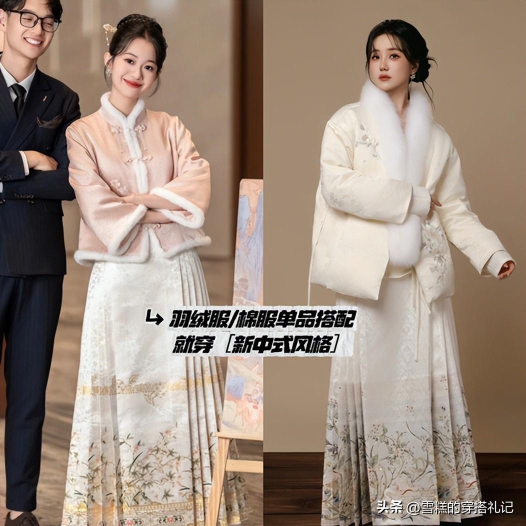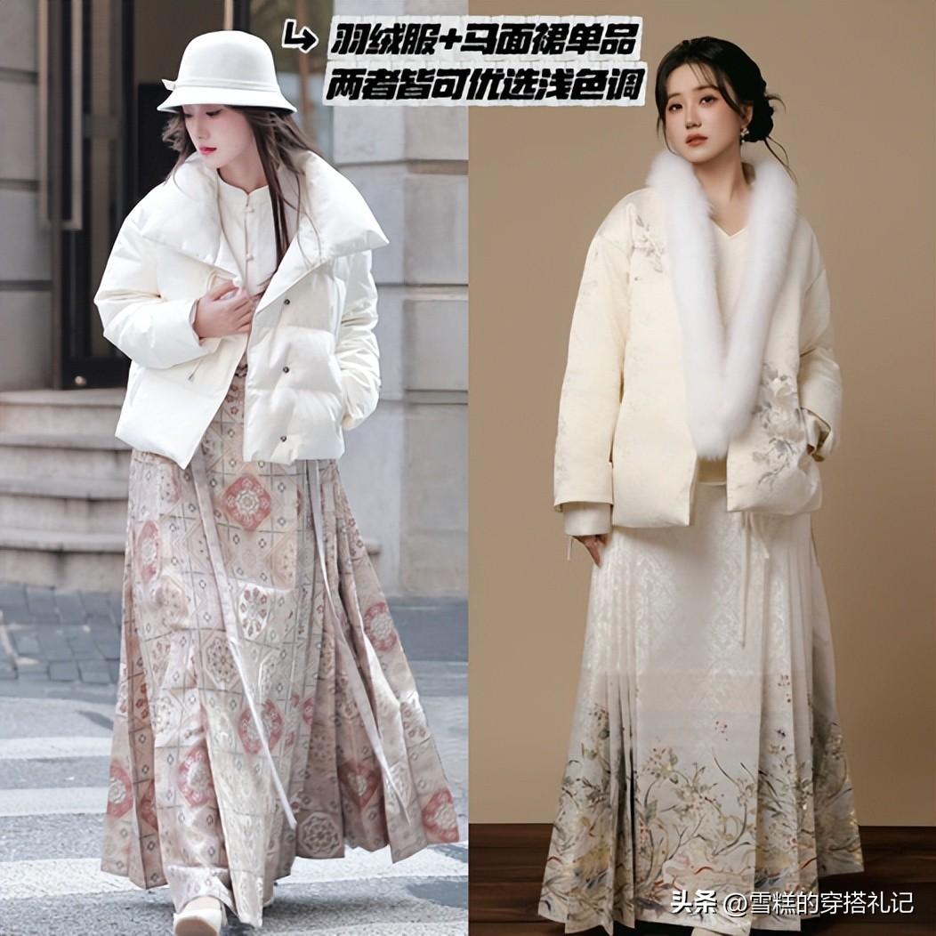 不管是羽絨服和棉服還是馬面裙的搭配,建議大家兩者皆可選擇淺色調或者是一些基礎的顏色,穿起來的時候給人的優雅和溫柔的性能。更爲明顯具有強調效果,尤其是40多歲的女性這樣的搭配真的很襯托女性魅力。