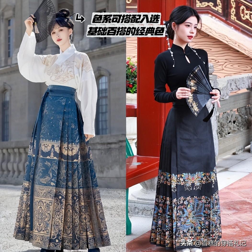 又或者想黑白系列以及藏藍色又或者是一些又高級又經典的宮廷色系,在馬面裙這一款單品的搭配當中是非常高級經典又很古典的氣質襯托,所以建議各位女性在今年可以多多的入手幾款不同色系進行搭配。