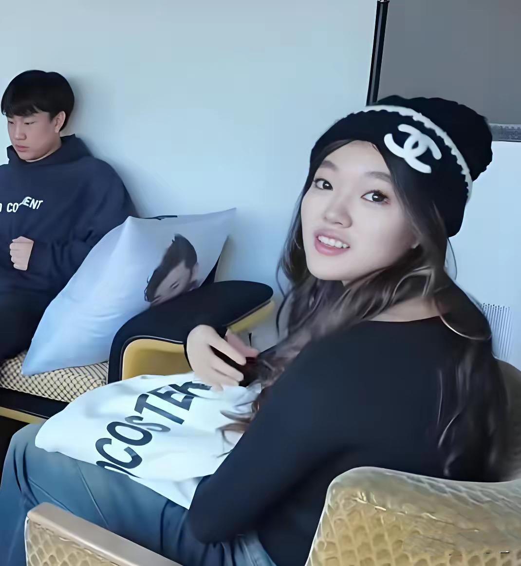 女孩子穿一件黑色衛衣、戴了香奈兒的針織帽,皮膚白淨無瑕、眼睛澄澈透亮,一頭捲髮溫柔又甜美,回眸的瞬間太驚豔了。