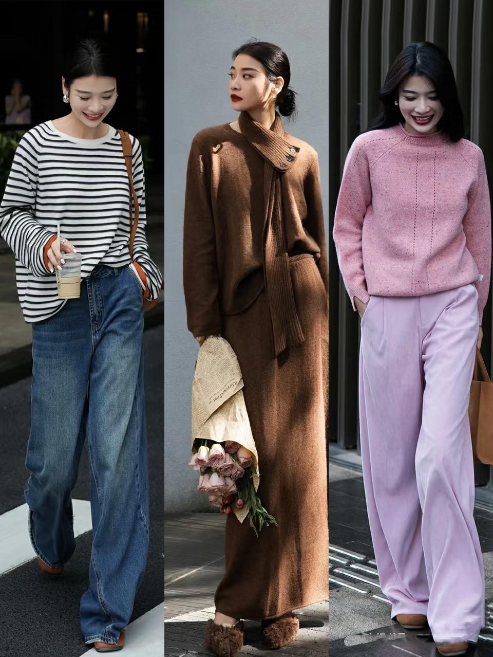 簡單的純色系打底衫、或者寬鬆的毛衣,以及直筒的闊腿褲,都可以讓我們的穿搭更有力量。像這種毛衣+闊腿褲的搭配,慵懶高級、彰顯氣質之美。