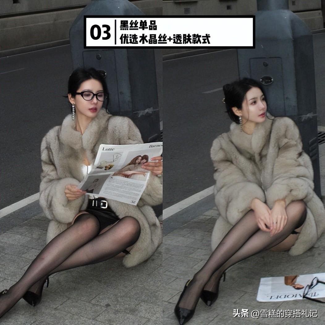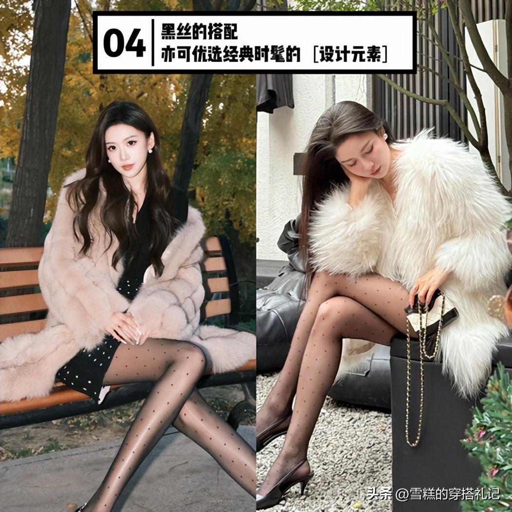如如果覺得純色系的黑色單品穿起來會比較單調,或者是想要呈現更加時髦的視覺效果,那麼就建議大家的黑絲單品可以入手一些像經典的波點或者有紋路以及時髦的千鳥格元素設計,搭配起來的時候與皮草也是非常契合的,尤其是千鳥格的元素對於我們腿型狀態的線條也能夠強調的更好看。