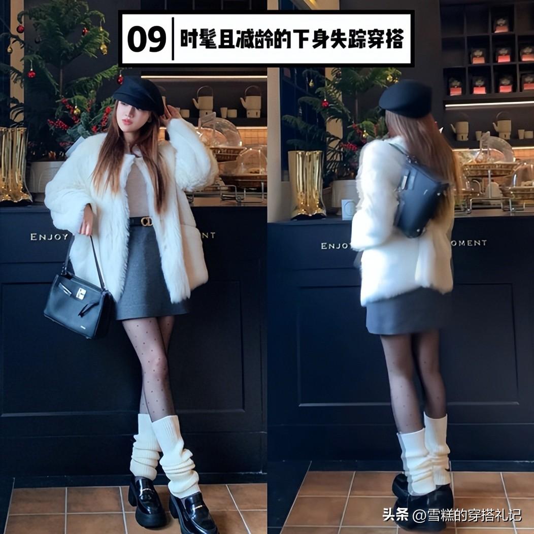 略微長款的皮草外套直接進行搭配的時候非常的適用於下身失蹤的穿搭,給人的感覺更加的具有減齡和時髦感,下半身的黑絲可以疊穿短款的白襪又或者是減齡感明顯的短靴系列。