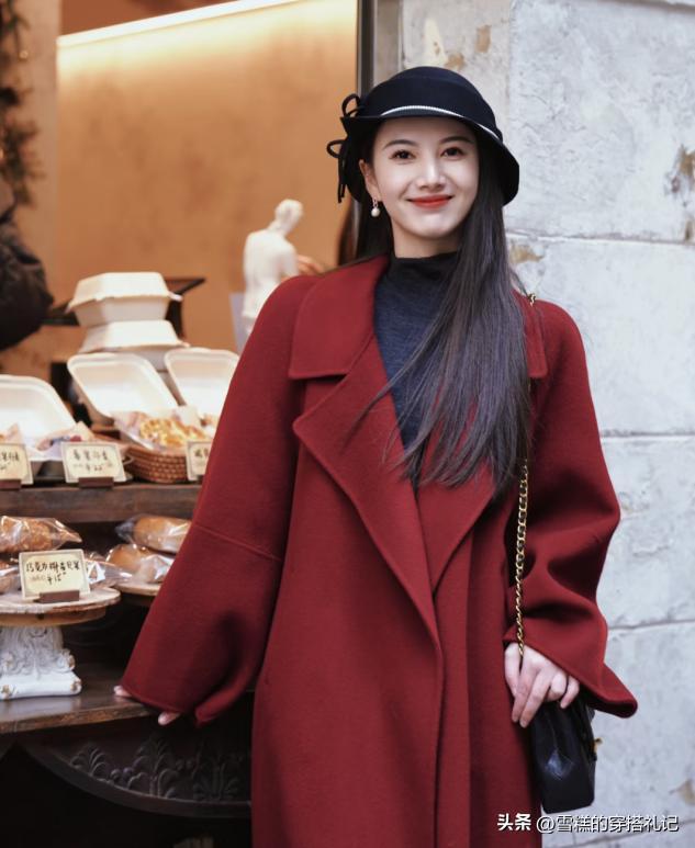 想要大衣的造型更加高級,搭配洋氣的帽子也是個不錯的選擇。圓臉的女人完全可以戴上一頂挺闊的毛呢貝雷帽,帽型小巧精緻,線條流暢,能夠更好的修飾圓臉,讓整個人更加有氣質,但是不建議選太亮的顏色,基礎的黑色貝雷帽配安可拉紅大衣會更加經典優雅。