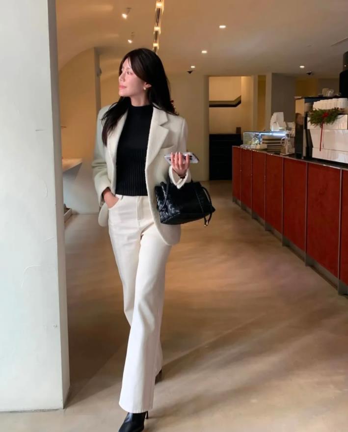 冬日裏如果想要穿出不俗的魅力,那麼可以選擇白色西裝和白色直筒褲,同色系的組合最時髦和高級了,清爽乾淨的白色宛如冬日的暖陽,溫柔雅緻還不失利落,適合職場的女性們,還很顯氣質。▼