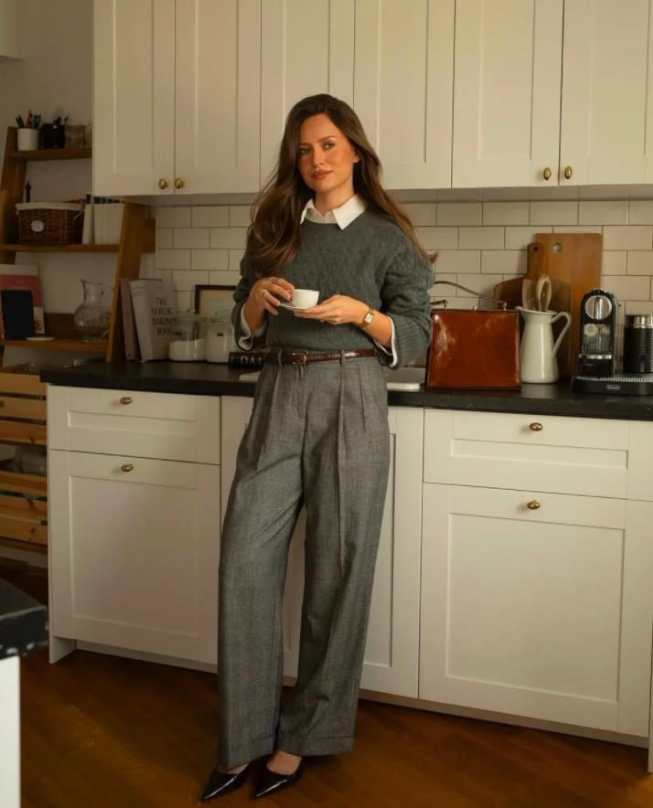 西裝可是時尚圈裏最經典百搭的褲子之一了,幹練利落感十足的西裝褲,早已經不是職場的專屬,上衣選擇灰色圓領毛衣,疊穿白襯衫,充滿學院風的打扮,很不失自然又滿滿老錢風的氣質感。 ▼